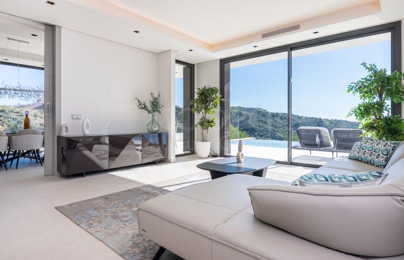 This new six-bedroom villa is situated on a south-facing plot in the exclusive gated community of Lomas de la Quinta, five minutes from Los Naranjos and La Quinta golf clubs. Offering breathtaking Mediterranean sea and mountain views, saltwater infinity pool, smart home systems, rooftop solarium, cinema room and the opportunity to create a guest apartment – this property offers a compelling opportunity in a rapidly booming area.