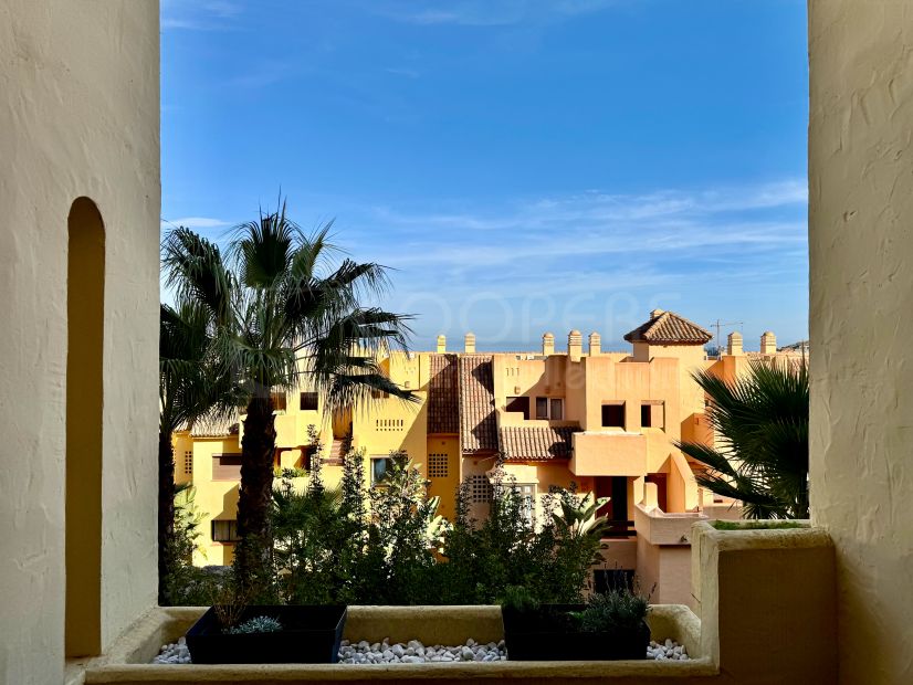 Set within the well-maintained Duquesa Village community, this elevated ground-floor apartment offers a strong sense of privacy and an open outlook over Mediterranean-style buildings, palm trees and partial coastal views.