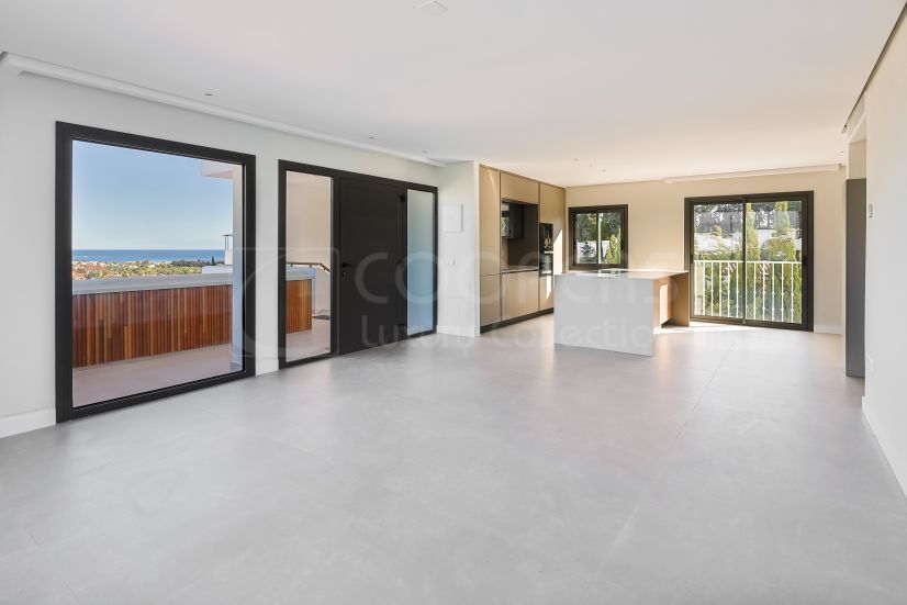 Incredible opportunity to purchase a two bedroom penthouse in the gated community of Jardines de Andalucía, Nueva Andalucia. This property has been renovated to the highest standard, with a spacious and bright open plan kitchen and living/dining area. There is one guest bedroom and bathroom, plus a large master en-suite. All the rooms have direct access to a private terrace with incredible views of La Concha Mountain and sea views. Other features include; fully fitted wardrobes, air-conditioning, electric blinds, one private parking space and storeroom. The complex itself is close to all leisure amenities, golf courses and beaches, making it a great holiday rental or year round home. There are several units for sale with options for reform or key ready apartment.