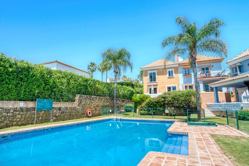 Elegant two bedroom, south west facing townhouse set within an exclusive gated community of just 20 homes, offering a perfect blend of contemporary style and Andalusian charm. Located in the sought-after Aloha area of Nueva Andalucia, it’s within walking distance to the peaceful Turtle Lake and only minutes from Puerto Banus, prestigious golf courses, and all essential amenities. This recently refurbished two-storey home features one guest bedroom and bathroom, large master en-suite, a bright living/dining room with fireplace, air conditioning, and direct access to a private terrace; ideal for enjoying the Mediterranean climate throughout the year. The kitchen is fully renovated and equipped with modern appliances, and a spacious double private garage adds both comfort and security, making it ideal for full-time living or as a second home. The community offers three well maintained swimming pools set in a tranquil environment, while nearby countryside trails and natural surroundings provide a serene lifestyle close to Marbella.