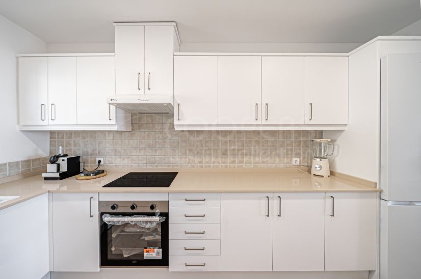 The apartment comprises two well-appointed bedrooms, including a luxurious master with en-suite bathroom, and a further high-quality bathroom. Modern features such as marble floors, underfloor heating in bathrooms, air conditioning, and double glazing ensure comfort and elegance at every turn. The kitchen is both fully fitted and equipped, offering a functional yet stylish space for culinary pursuits, while the spacious living room enjoys natural light and direct terrace access—perfect for entertaining or relaxing admiring the panoramic vista.
