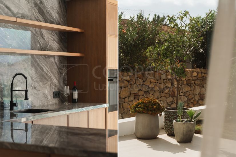Upstairs, the master suite offers a serene retreat with a walk-in wardrobe, private terrace, and a spacious bathroom with both a bath and a shower. The rooftop terrace provides sweeping Golf Valley views and glimpses of the Mediterranean Sea, perfect for relaxation or entertaining guests.