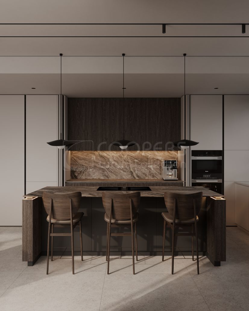 The villa has eight en-suite bedrooms, all with built-in wardrobes. The master suite includes a walk-in closet. The neutral interior design, natural materials, and floor-to-ceiling windows create bright and open living areas. The open-plan kitchen, dining, and living space provide a functional layout, with large sliding doors connecting to terraces, a private garden, and a swimming pool.