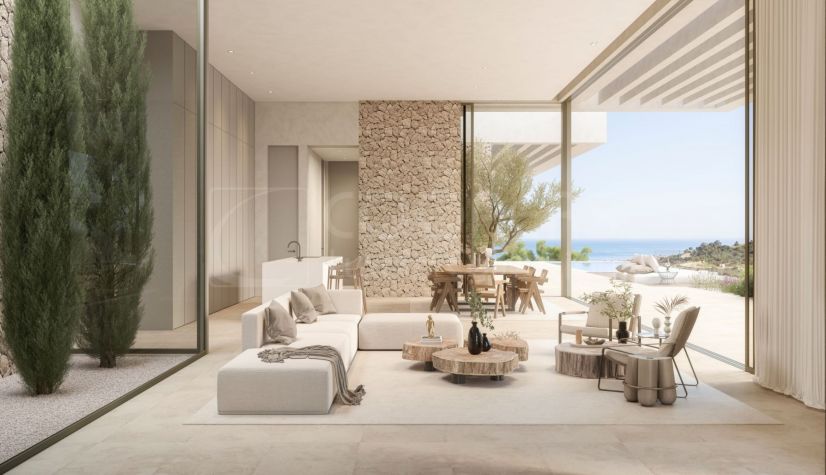Proyecto de Villas: La Reserva de la Cala Golf. Esta villa contemporánea en venta está ubicada en La Cala Golf, Mijas Costa, entre Marbella y la ciudad de Málaga, Costa del Sol, Sur de España. El proyecto de villa de lujo ofrece fabulosas vistas panorámicas al mar y a la montaña, total comodidad y privacidad, rodeado de un hermoso paisaje verde. La propiedad se construirá con materiales de alta calidad y cuenta con 4 dormitorios, 4 baños en-suite, 1 aseo, cocina abierta totalmente equipada con electrodomésticos Miele y una cocina trasera adicional, terrazas cubiertas y descubiertas, piscina privada con agua salada, jardín mediterráneo con palmeras, olivos, cipreses y sistema de riego automático y garaje privado para 2 coches. También viene con aire acondicionado frío/calor, suelo radiante en toda la propiedad, ascensor, ventanas de piso a techo con doble acristalamiento, sistema domótico, placas solares y preinstalación para unidad de carga de vehículos eléctricos. Los extras y características personalizadas como se ilustran en imágenes 3D, como un quinto dormitorio en suite, sala de cine, fitness, jacuzzi, sauna, bodega, cocina exterior, piscina climatizada, etc., son opcionales y pueden incluirse como coste adicional (no incluidos en el precio de venta).