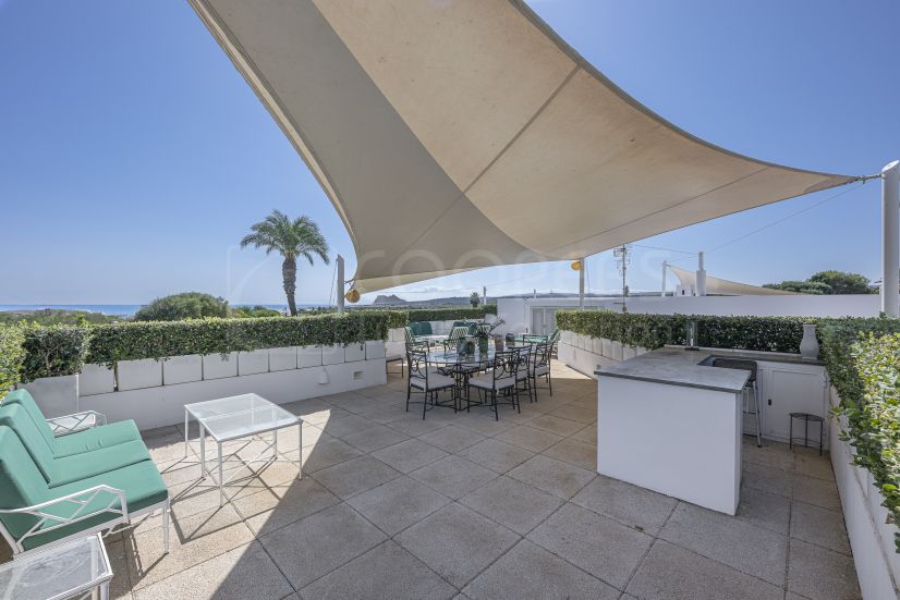 Exteriores y terraza: • Gran terraza cubierta con cortinas de cristal, ideal para todo el año • Terraza en la azotea con vistas panorámicas: playa, Peñón de Gibraltar, bosque de alcornoques y Mar Mediterráneo • Cocina en la terraza, perfecta para reuniones y entretenimiento